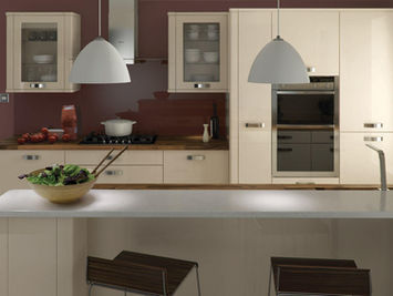 Beige is the perfect neutral to introduce confident tonal contrast through your choice of worktops and accessorisation. Here, we have used Walnut for the main worktop, combining it with white Silestone Quartz for the breakfast bar. A full height splashback adds style and practicality.